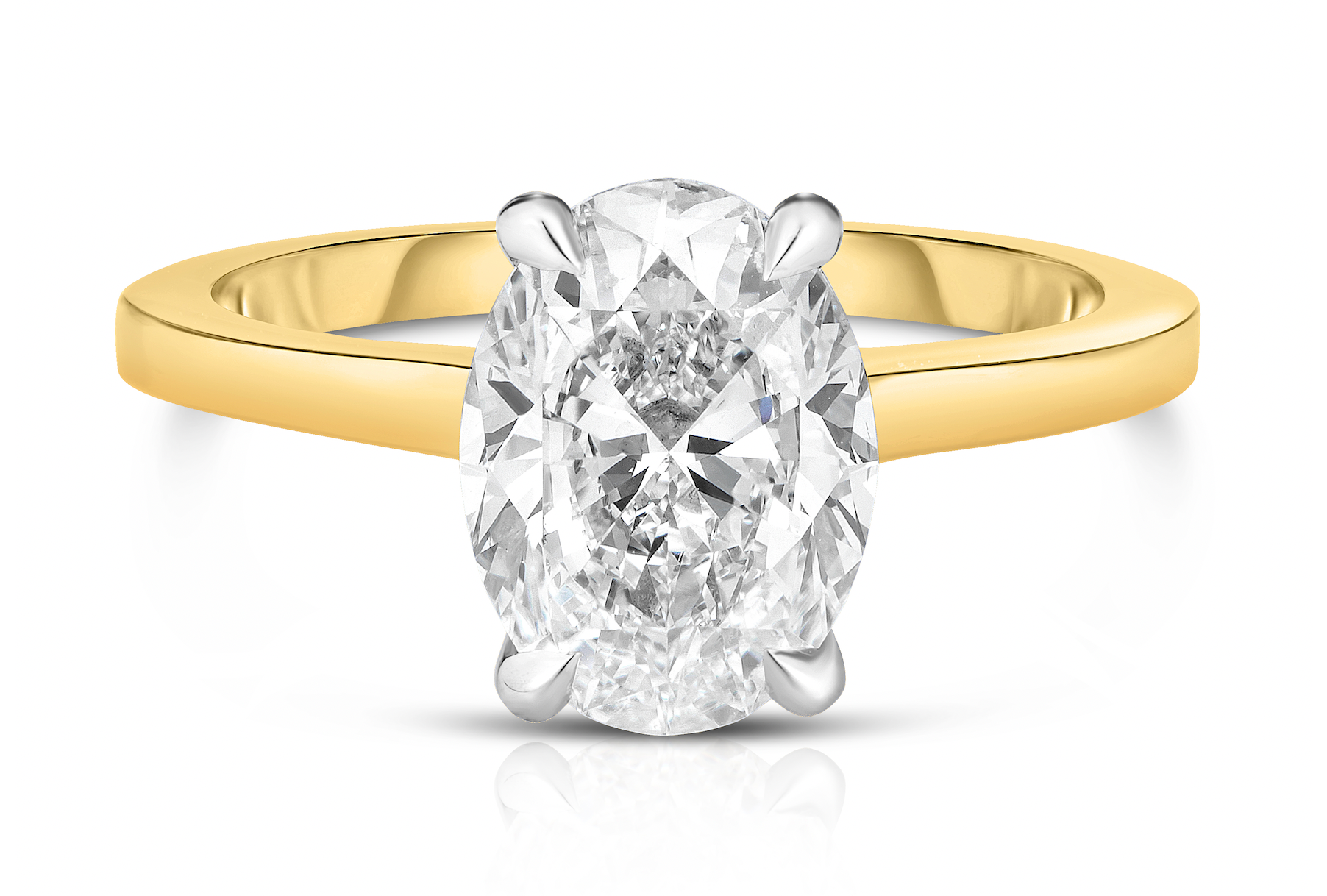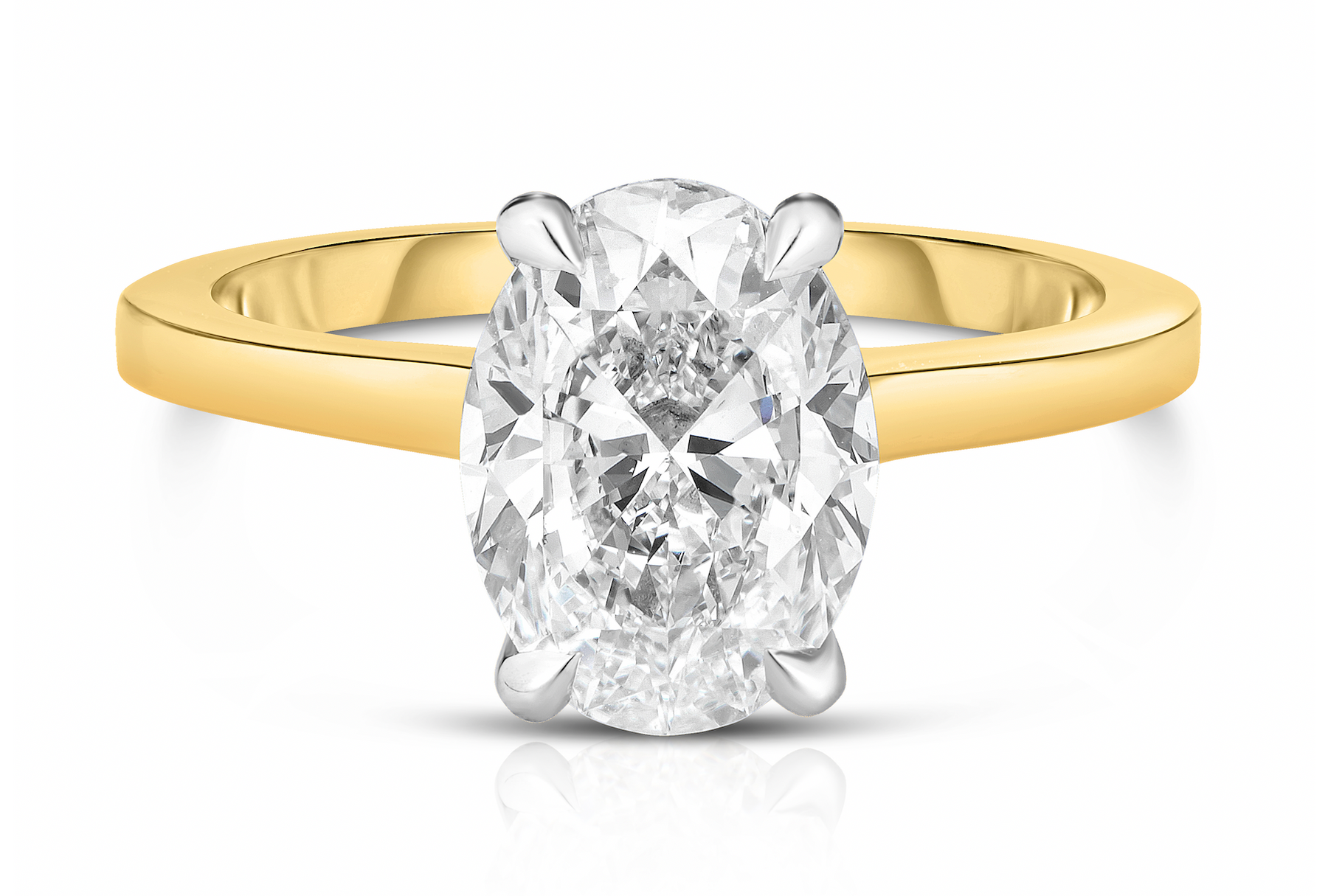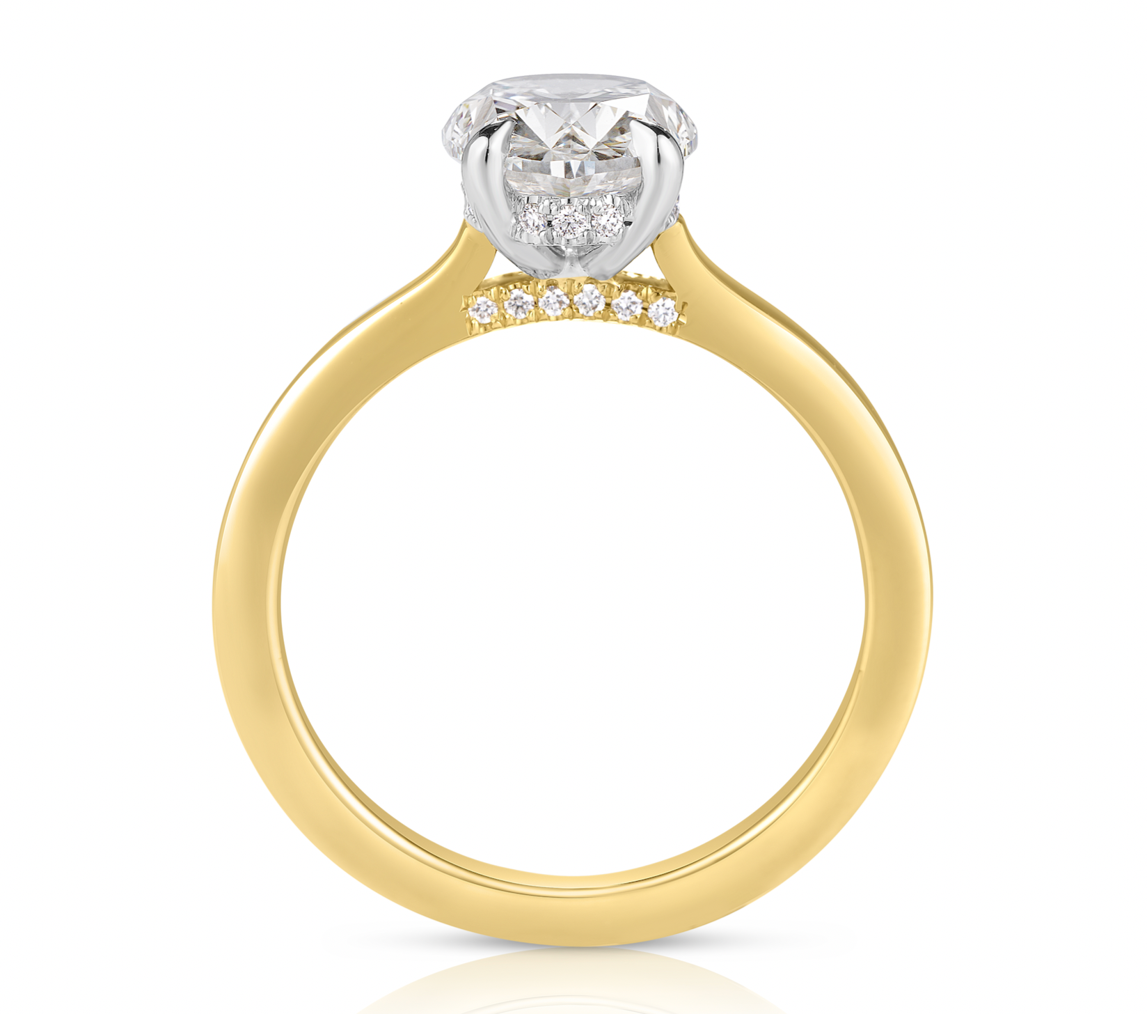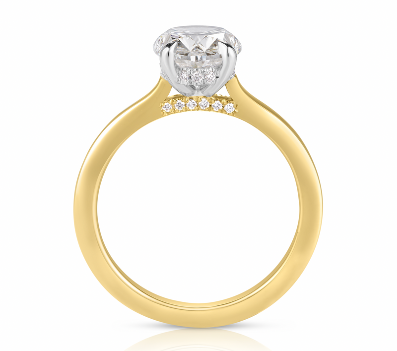 Custom 2 Tone Oval Engagement Ring with Side Diamonds + Underneath Halo